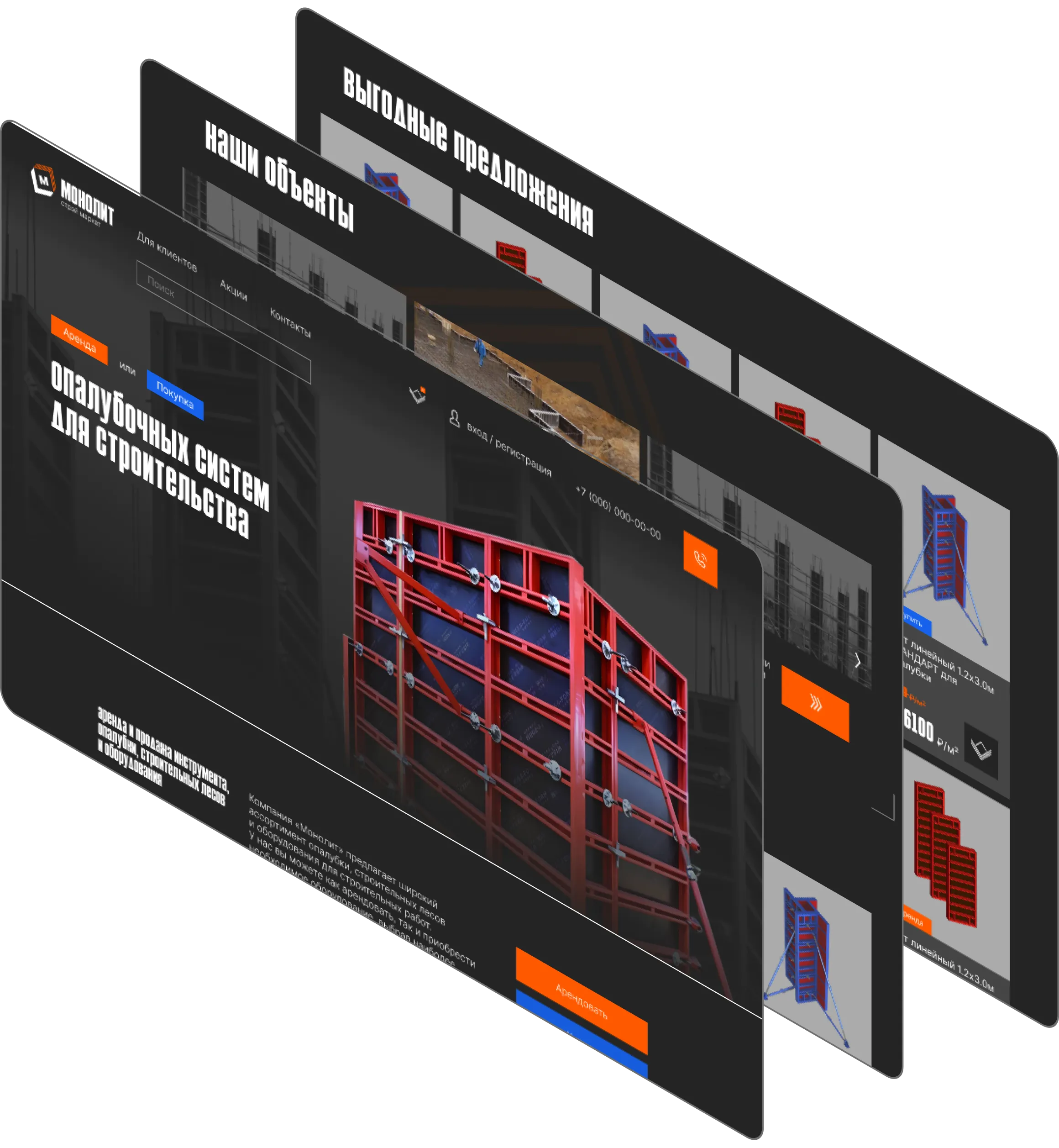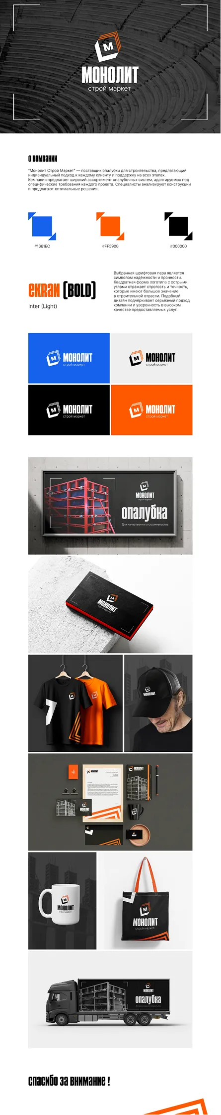 За основу стиля «Монолита» взята палитра из сдержанного темно-серого с яркими акцентами оранжевого и синего. Шрифты и квадратная, строгая форма логотипа подчеркивают надежность и точность — ключевые ценности компании в строительной сфере.