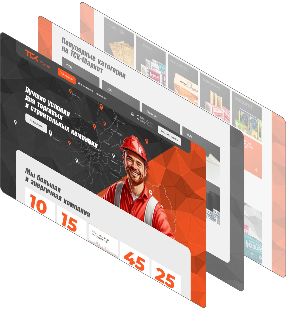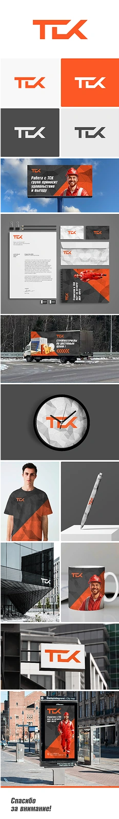 Фирменный стиль — состоит из палитры цветов оранжевого и тёмно-серого цветов. На фоне используется геометрическая абстракция. Чёткие линии и контрастная палитра передают профессионализм, а графика усиливает узнаваемость. Стиль отражает надёжность компании и её приверженность инновациям в строительной сфере.