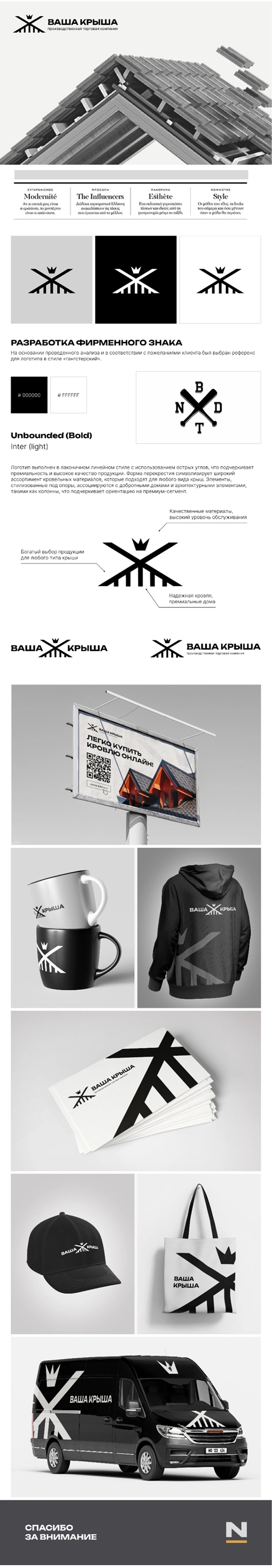 Фирменный стиль компании «Ваша Крыша» отражает суть бренда через строгие и статусные визуальные решения. Цветовая палитра построена на контрастном сочетании глубокого черного и чистого белого.